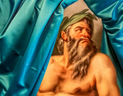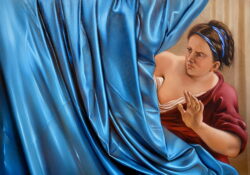 Die Werkreihe „Satin – elegant und angenehm zu tragen“ hinterfragt gesellschaftliche Vorstellungen von Männlichkeit. In fein gearbeiteten Bildern kombiniert der Künstler historische Gemälde mit seidigen Draperien und schafft neue Bildkompositionen voller Symbolik. Seine Werke fordern dazu auf, traditionelle Geschlechterrollen zu überdenken und den Zusammenhang zwischen Normen, Emotion und persönlicher Freiheit zu reflektieren.